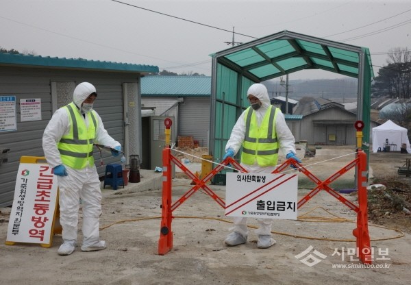 최근 경기 이천시는 설성면 장천리에 위치한 한 양계농장에서 조류 인플루엔자(AI) 의심축이 발생된 것으로 확인됨에 따라 '긴급 방역활동'을 실시했다. 사진은 관계자들이 입구를 통제하고 있는 모습.(사진제공=이천시청)