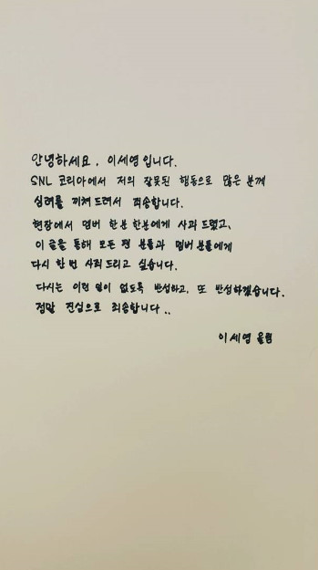 공개된 사과문은 “반성하고 반성하겠다”며 “정말 진심으로 죄송하다”고 반성의 뜻을 남겼다.