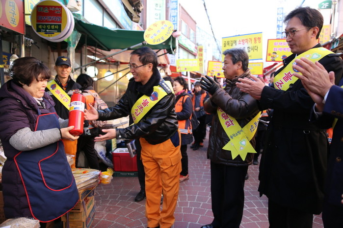 지난 28일 동작소방서는 사당2동 남성시장 일대에서 이창우 동작구청장(맨 오른쪽), 소방공무원 등 154명이 참석한 가운데 화재예방 불조심 강조의 달 캠페인을 실시했다. 사진은 박찬호 서장이 상인에게 소화기를 전달하는 모습.(사진제공=동작소방서)