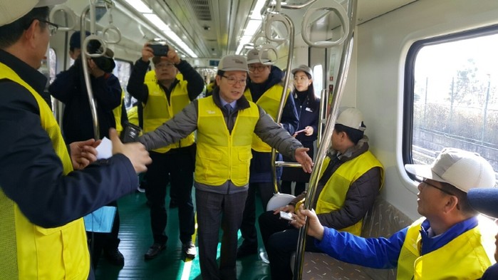 지난 28일 경기 김포시는 현대로템 경남 창원공장에서 김포도시철도 '골드라인' 완성차 시승 및 점검을 실시했다. 사진은 유영록 시장이 관계자들과 골드라인 차량 시승을 하고 있는 모습.(사진제공=김포시청)