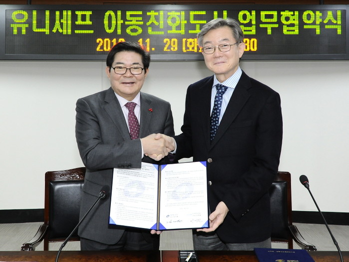 지난 29일 광진구가 유니세프한국위원회와 함께 구청 기획상황실에서 아동친화도시 조성을 위한 업무협약을 맺었다. 사진은 김기동 구청장(왼쪽)과 서대원 사무총장이 협약서를 들고 기념촬영 하는 모습.(사진제공=광진구청)
