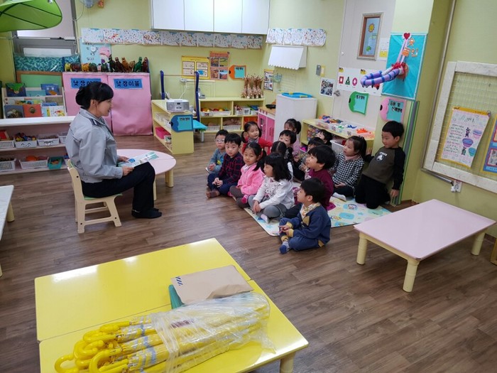 최근 충남 아산경찰서는 어린이 교통안전을 위해 신도시 아파트 단지내 어린이집을 방문해 '찾아가는 교통안전 홍보 활동'을 전개했다. 사진은 경찰관이 어린이들에게 교통안전 교육을 하는 모습.(사진제공=아산경찰서)