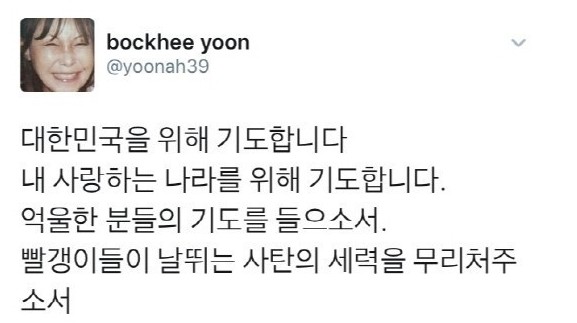 지난 29일 윤복희의 트위터에는 “대한민국을 위해 기도합니다. 내 사랑하는 나라를 위해 기도합니다. 억울한 분들의 기도를 들으소서. 빨갱이들이 날뛰는 사탄의 세력을 물리쳐주소서”라는 글이 게재됐다.