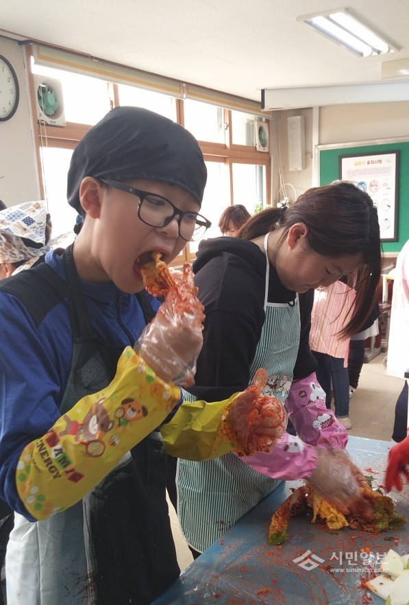 지난 30일 경기 부천시 부원초등학교는 5학년 학생들과 학부모회, 교사들이 함께 생명존중 프로젝트로 '김치 담그기' 활동을 실시했다. 사진은 학생들이 김장을 하며 김치를 시식하는 모습.(사진제공=부천시청)