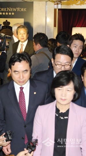 더불어민주당 추미애 대표(앞)와 새누리 비주류 비상시국회의를 이끌고 있는 김무성 전 대표가 1일 오전 서울 여의도 한 호텔에서 탄핵관련 긴급회동을 마친 뒤 회담장을 빠져 나오고 있다.