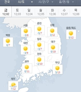 오후에는 서울이 8도, 춘천 7도, 대전 9도, 부산 13도, 강릉 13도까지 기온이 크게 오른다.