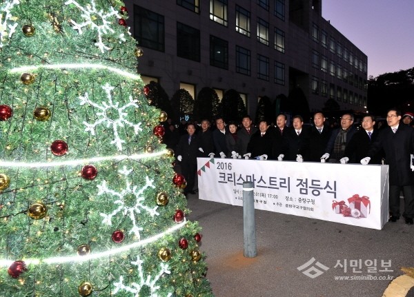 서울 중랑구는 지난 1일 구청 1층에서 ‘2016 크리스마스트리 점등식’을 개최했다. 사진은 나진구 구청장(오른쪽에서 다섯 번째)이 구 교구협의회 목사와 신도, 구 신우회원 등 주민들과 점등식을 하는 모습.(사진제공=중랑구청)