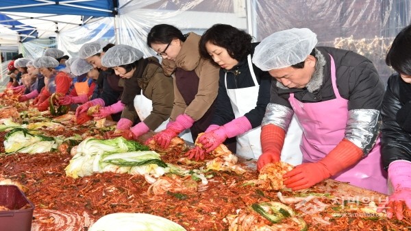 지난 2일 나진구 서울 중랑구청장(맨 오른쪽)이 구청 중앙광장에서 실시한 ‘2016 중랑구 장애인 무료급식소 김장담그기’ 행사에 참석해 자원봉사자 회원들과 함께 김장을 하고 있다.(사진제공=중랑구청)