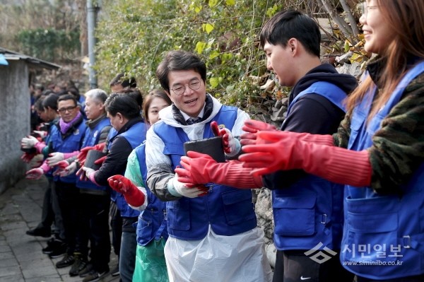 지난 5일 서울 성동구는 사근동 성민교회 인근 저소득 2가구에 연탄 600장 등을 전달하는 '사랑의 연탄으로 희망 나르기' 행사를 진행했다. 사진은 정원오 구청장(오른쪽에서 세번째)이 봉사자들과 연탄을 나르는 모습.(사진제공=성동구청)
