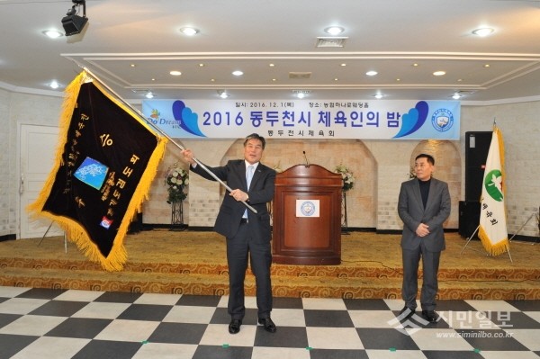 최근 경기 동두천시는 오세창 시장, 장영미 시의장, 도·시의원, 최범 체육회 수석부회장 등 200여명이 참석한 가운데 '제27회 경기도 생활체육 대축전 해단식 및 2016년 체육인의 밤' 행사를 개최했다. 사진은 오 시장이 기를 흔드는 모습.(사진제공=동두천시청)