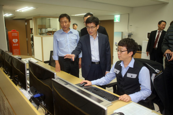 지난 5일 주윤중 강남구 부구청장은 제249차 안전점검의 날을 맞아 지역내 대형건축물인 그랜드 인터컨티넨탈호텔을 방문해 재난 예방 시설을 점검했다. 사진은 주 부구청장(가운데)이 시설 관계자와 이야기하는 모습.(사진제공=강남구청)