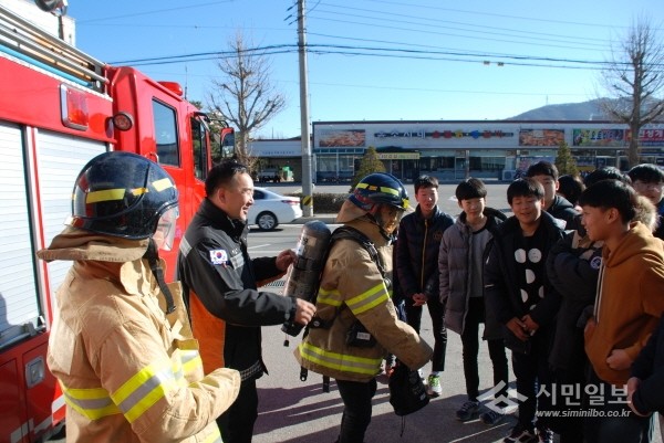 지난 6일 경기 양주소방서는 조양중학교 학생 20여명을 대상으로 미래소방관 직업체험교실을 운영했다. 사진은 교육에 참여한 학생들이 방화복 입어보기 체험을 하는 모습.(사진제공=양주소방서)