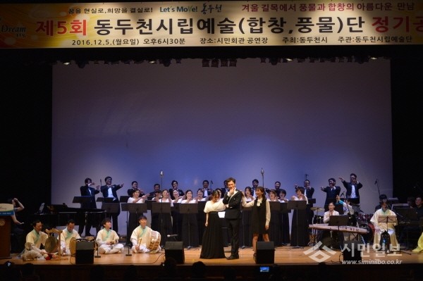 경기 동두천시는 지난 5일 시민회관 공연장에서 ‘동두천시립예술단 정기공연’을 성황리에 개최했다. 사진은 시립합창단과 시립이담풍물단이 함께 공연을 펼치는 모습.(사진제공=동두천시청)