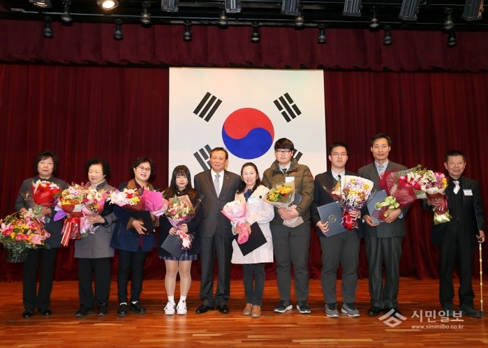 금천구는 지난 5일 구청 대강당에서 자원봉사자의 날 기념행사를 개최했다. 사진은 행사에 참여한 차성수 구청장(왼쪽에서 다섯 번째)과 자원봉사자 등이 기념촬영을 하는 모습.(사진제공=금천구청)