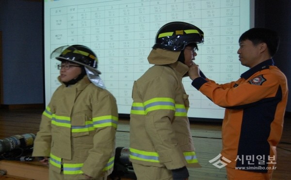 경기 안성소방서는 8일 서운중학교 학생 34명을 대상으로 '찾아가는 미래 소방관 직업체험교육'을 실시했다. 사진은 교육에 참여한 학생들이 방화복을 입어보는 모습.(사진제공=안성소방서)