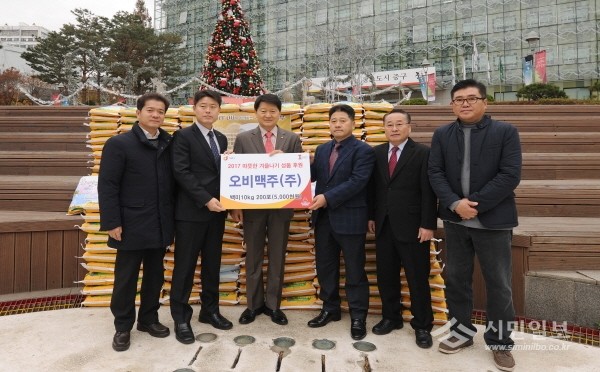 오비맥주(주)는 최근 서울 중구에 어려운 이웃들이 따뜻한 겨울을 보낼 수 있도록 500만원 상당의 백미 20kg·200포를 중구청에 전달했다. 사진은 최창식 구청장(왼쪽에서 세 번째)과 관계자들이 기념촬영하는 모습.(사진제공=중구청)