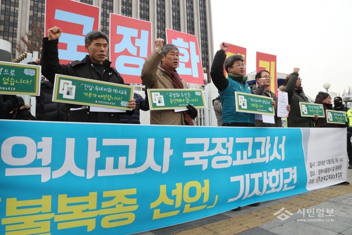 오후 서울 정부서울청사 앞에서 열린 '역사교사 국정교과서 불복종 선언 기자회견'에서 참석자들이 국정 역사교과서 반대 구호를 외치고 있다.