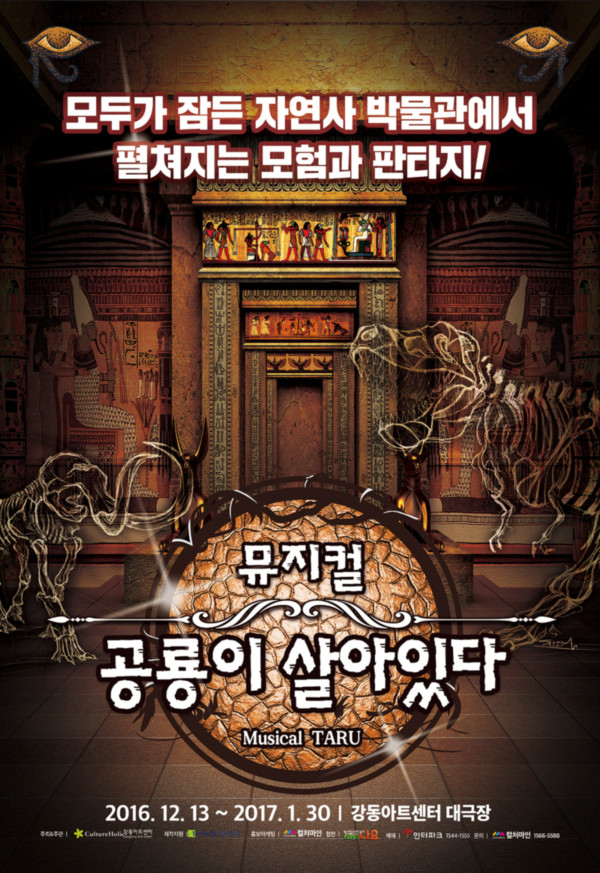 이번 뮤지컬은 라이브 밴드와 17명의 전문 뮤지컬 배우들이 박물관을 배경으로 아이들이 좋아하는 티라노사우루스, 트리케라톱스, 맘모스 등 공룡화석을 오브제로 생동감 넘치는 무대로 오는 2017년 1월30일까지 진행된다.