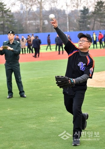최근 서울 노원구는 공릉동 화랑로 육군사관학교 부지에 조성한 육사 야구장의 개장식을 개최했다. 사진은 개장식에 참석한 김성환 구청장이 시구를 하고 있는 모습.(사진제공=노원구청)
