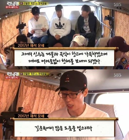 지난 11일 방송된 SBS 예능프로그램 '런닝맨'에서는 멤버들이 전주 한옥마을에서 은밀한 작전을 펼치는 가운데 유재석이 2017년 신년 운세를 뽑아 들었다.