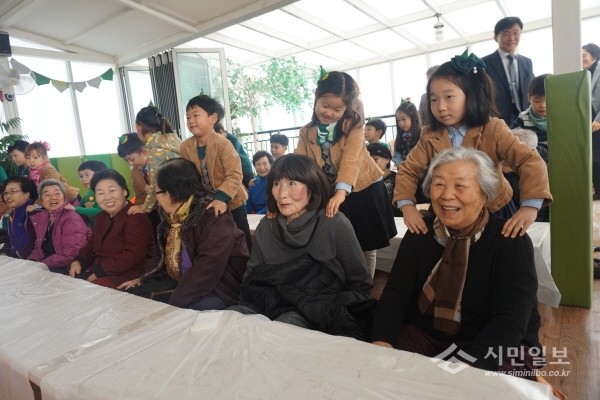 지난 12일 서울 은평구 갈현2동 지역보장협의체는 색동유치원 원아들과 함께 홀몸노인들의 외로움을 달래주는 '초록산타 잔치'를 개최했다. 사진은 어린이들이 노인들에게 안마를 하고 있는 모습.(사진제공=은평구청)