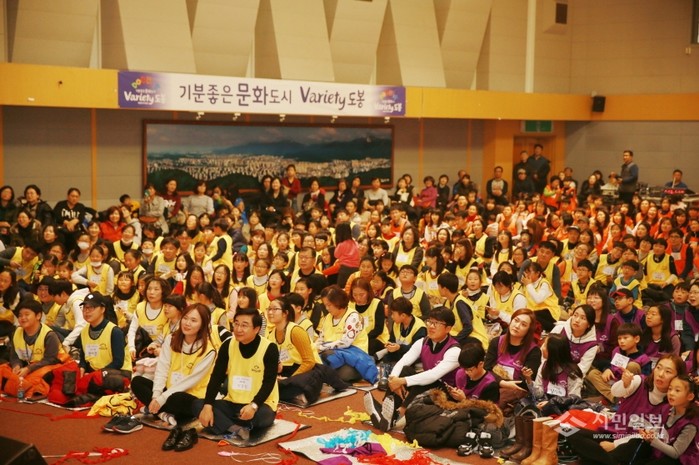 최근 도봉구는 구청 대강당에서 구의 새 도시 브랜드 선포를 기념하는 ‘도시브랜드 선포 및 Variety 도봉 문화퀴즈대회’를 개최했다. 사진은 이동진 구청장(앞줄 가운데)이 참가자들과 함께 퀴즈를 풀고 있는 모습.(사진제공=도봉구청)