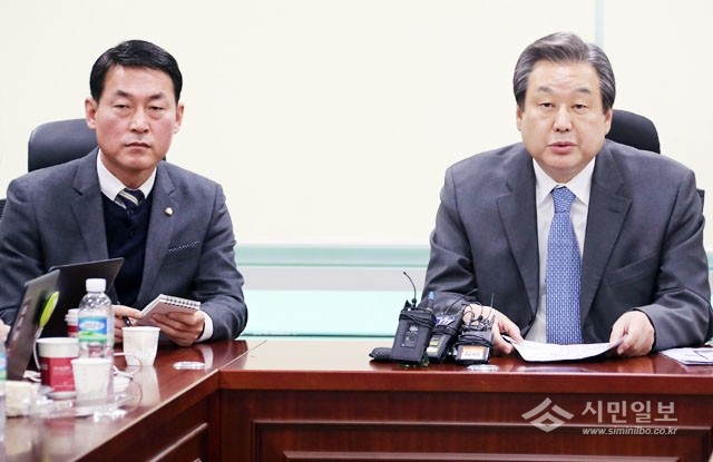 새누리당 김무성 전 대표가 13일 오전 국회 의원회관에서 비상시국위원회 회의를 마친 뒤 기자간담회를 하고 있다. 왼쪽은 황영철 의원