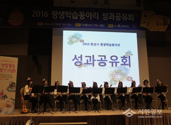 지난 13일 경기 화성시는 라비돌리조트에서 평생학습동아리 회원 100여명이 참석한 가운데 '성과공유회'를 개최했다. 사진은 무대 위에서 동아리 회원들이 연주 공연을 펼치고 있는 모습.(사진제공=화성시청)