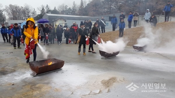 지난 14일 경기 여주소방서는 여주컨트리클럽에서 관계자 및 경기보조원 100여명 대상으로 '소소심(소화기·소화전·심폐소생술) 교육'을 실시했다. 사진은 참여자들이 소화기 사용 실습을 하는 모습.(사진제공=여주소방서)