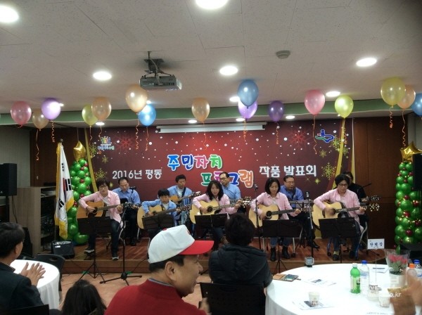 지난 14일 경기 수원시 권선구 평동에서는 주민센터 대회의실에서 한 해 동안 수강생들이 갈고 닦아온 솜씨와 기량을 발휘하는 '2016 평동 주민자치센터 작품발표회 및 송년회'를 개최했다. 사진은 참여자들이 공연하는 모습.(사진제공=권선구청)