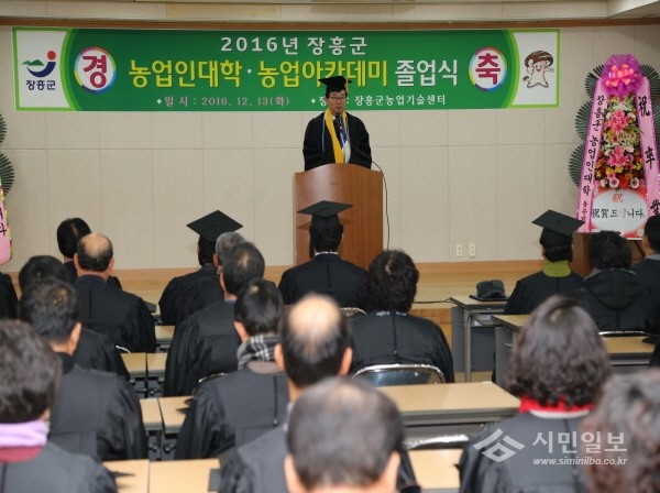 최근 전남 장흥군은 졸업생 및 가족 등 100여명이 참석한 가운데 군 농업기술센터에서 농업인대학·농업아카데미 졸업식을 개최했다. 사진은 김성 군수가 졸업생들에게 축사하는 모습.(사진제공=장흥군청)