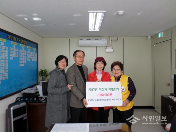 15일 인천 계양구 계양3동 적십자희망나눔봉사회는 계양3동 주민센터를 방문해 2017년도 적십자특별회비 100만원을 전달했다. 사진은 사진은 이경남 봉사회장을 비롯한 관계자들이 기념촬영을 하는 모습.(사진제공=계양구청)