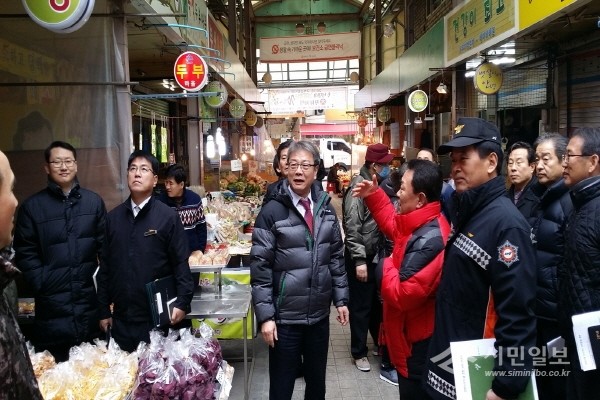 최근 한수동 서울 구로구 부구청장을 단장으로 한 합동점검반은 구로소방서와 함께 고척근린시장을 방문해 화재 예방 조치상황을 점검했다. 사진은 한 부구청장(가운데)과 점검반이 시장을 살펴보고 있는 모습.(사진제공=구로구청)