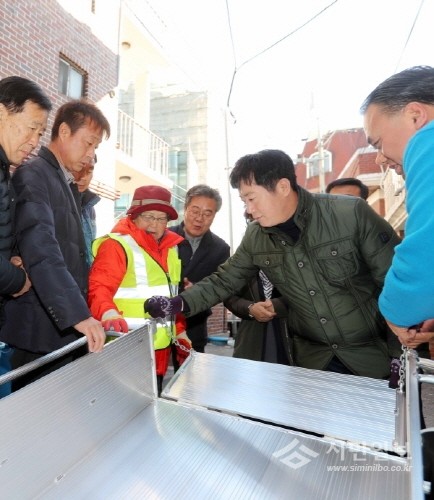 지난 15일 경기 용인시 처인노인복지관은 경기사회복지공동모금회의 지원을 받아 안전장치가 부착된‘사랑의 손수레’를 특별 제작해 지역내 폐지 줍는 노인 18명에게 전달했다. 사진은 정찬민 시장(가운데)이 손수레를 살펴보는 모습.(사진제공=용인시청)