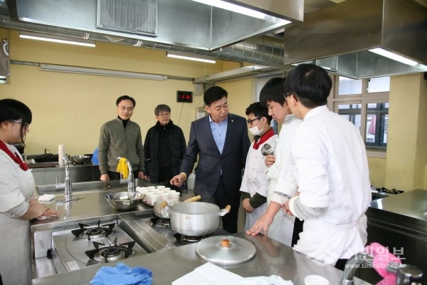 최근 성흠제 서울 은평구의장은 응암문화예술정보학교와 응암3동 주민자치위원회가 주최한 사랑의 재능나눔 행사에 참석해 봉사자들을 격려했다. 사진은 성 의장(오른쪽에서 네번째)이 조리 봉사에 나선 학생들과 이야기를 나누는 모습.(사진제공=은평구의회)