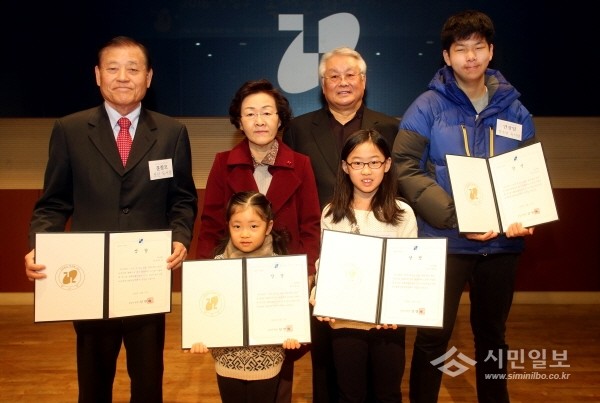 최근 신연희 서울 강남구청장은 대치2문화센터에서 열린 ‘2016 강남구 독서문화상’ 시상식에 참석해 다독자 등에게 상을 수여했다. 사진은 신 구청장(왼쪽에서 두번째)이 수상자들과 사진 촬영하는 모습.(사진제공=강남구청)