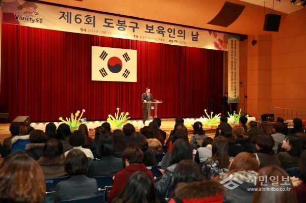 최근 서울 도봉구는 구청 대강당에서 구어린이집연합회 주관으로 지역내 보육교사의 노고를 격려하는 '2016년 제6회 도봉구 보육인의 날' 행사를 개최했다. 사진은 이동진 구청장이 축사하고 있는 모습.(사진제공=도봉구청)