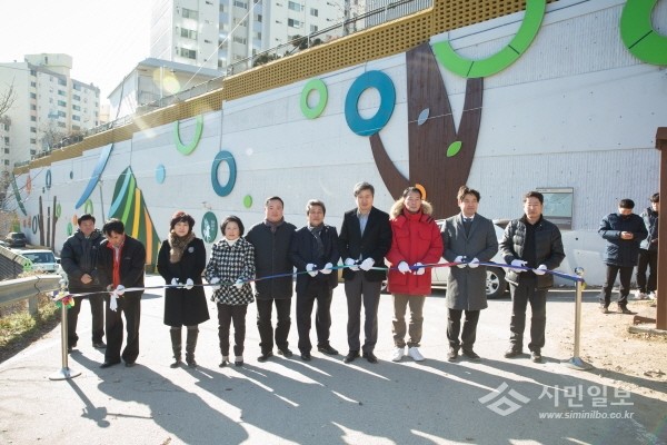 최근 인천 서구는 가정동 하나·대우아파트 인근에서 시행된 ‘하나2차아파트 옹벽디자인 개선사업’을 마무리하고 준공식을 개최했다. 사진은 강범석 구청장(오른쪽에서 네 번째)과 관계자들이 테이프 커팅식을 하는 모습.(사진제공=인천서구청)