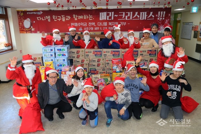 최근 서초구는 ‘사랑의 바자회’에서 세무1·2과 직원들과 다니엘복지원 장애우들이 함께 마련한 수익금으로 크리스마스 선물을 구매해 다니엘복지원에 전달했다. 사진은 관계자들이 선물 전달식 후 사진 촬영을 하는 모습.(사진제공=서초구청)