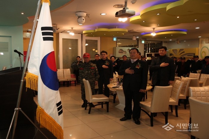 최근 성동구는 보훈단체 연합회 주관으로 대통령 탄핵 등 어수선한 사회적 분위기를 감안, 연말 송년회를 대신해 안보교육을 실시했다. 사진은 정원오 구청장(오른쪽에서 두번째)과 관계자들이 행사를 진행하는 모습.(사진제공=성동구청)
