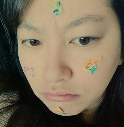 신애는 공개된 사진 속 및난에 딸이 붙인 것으로 추측되는 스티커를 붙인 채 뾰루퉁한 표정을 짓고 있다.
