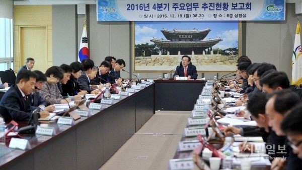 지난 19일 경기 광주시는 상황실에서 조억동 시장 주재로 국·소장, 담당관, 과장, 읍·면·동장 등 60여명이 참석한 가운데 '2016년 4분기 주요업무 추진현황 보고회'를 개최했다. 사진은 조 시장(가운데)이 회의를 주재하는 모습.(사진제공=광주시청)