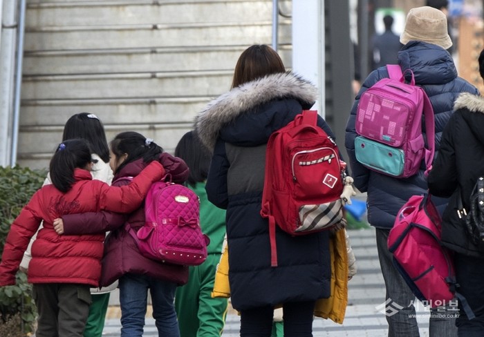 초중고 독감 환자가 1천명당 152.2명으로 역대 최고치를 기록한 것으로 알려진 20일 오후 서울 서대문구의 한 초등학교에서 학생들이 하교하고 있다.