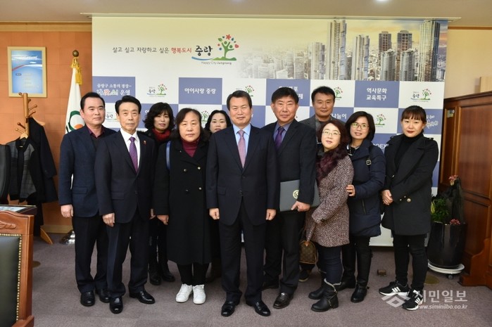 중랑구는 지난 20일 학교밀집지역의 청소년보호 활동 강화를 위해 ‘중화중학교 학교감시단’ 지정서 수여식을 개최했다. 사진은 수여식에 참여한 나진구 구청장(가운데) 및 관계자들이 기념촬영을 하는 모습.(사진제공=중랑구청)