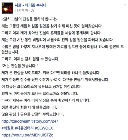 네티즌 수사대 자로는 오는 25일 크리스마스에 세월호 참사의 진실 다큐멘터리를 공개하겠다고 선언했다.
