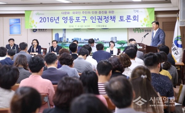 | ▲ 다문화·외국인 주민의 인권 증진을 위한 '2016년 영등포구 인권정책 토론회'에서 조길형 구청장(오른쪽)이 인사를 건내고 있다. | ||