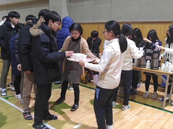 충남 아산시 음봉중학교는 지난 22일 전교생을 대상으로 꿈과 끼를 펼치는 자유학기제 운영 결과 발표회를 실시했다. 사진은 동아리 활동으로 바리스타가 만든 커피를 학생들이 시음하는 모습.(사진제공=아산교육지원청)
