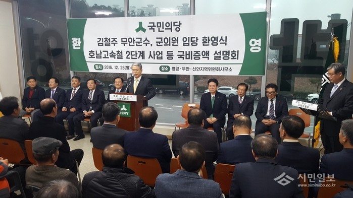 더불어민주당을 탈당한 김철주 무안군수가 26일 오전 11시 박준영 국회의원 사무실에서 지지자300여명이 참석한 가운데 국민의당 입당식을 가졌다. 이날 입당식에는 국민의 당 김동철 비대위원장을 비롯해 김 군수와 함께 입당한 김만수ㆍ정길수ㆍ김원중 군의원 3명 등이 참석했다. /사진제공=황승순 기자