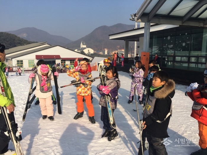최근 경기 이천시 마장면 주민자치평생학습센터에서는 마장초교 전교생을 대상으로 지산리조트에서 '스키교실'을 운영했다. 사진은 스키교실에 참가한 어린이들이 강습을 받고 있는 모습.(사진제공=이천시청)
