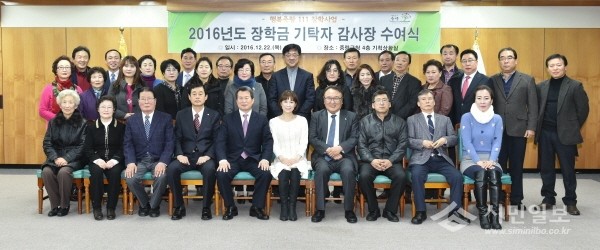 최근 나진구 중랑구청장(왼쪽에서 다섯 번째)이 구청 기획상황실에서 ‘행복중랑 111 장학사업’에 참여해준 기탁자 30여명을 초청해, 감사를 표하기 위한 ‘장학금 기탁자 감사장 수여식’을 개최한 후 기념촬영을 하고 있다.(사진제공=중랑구청)